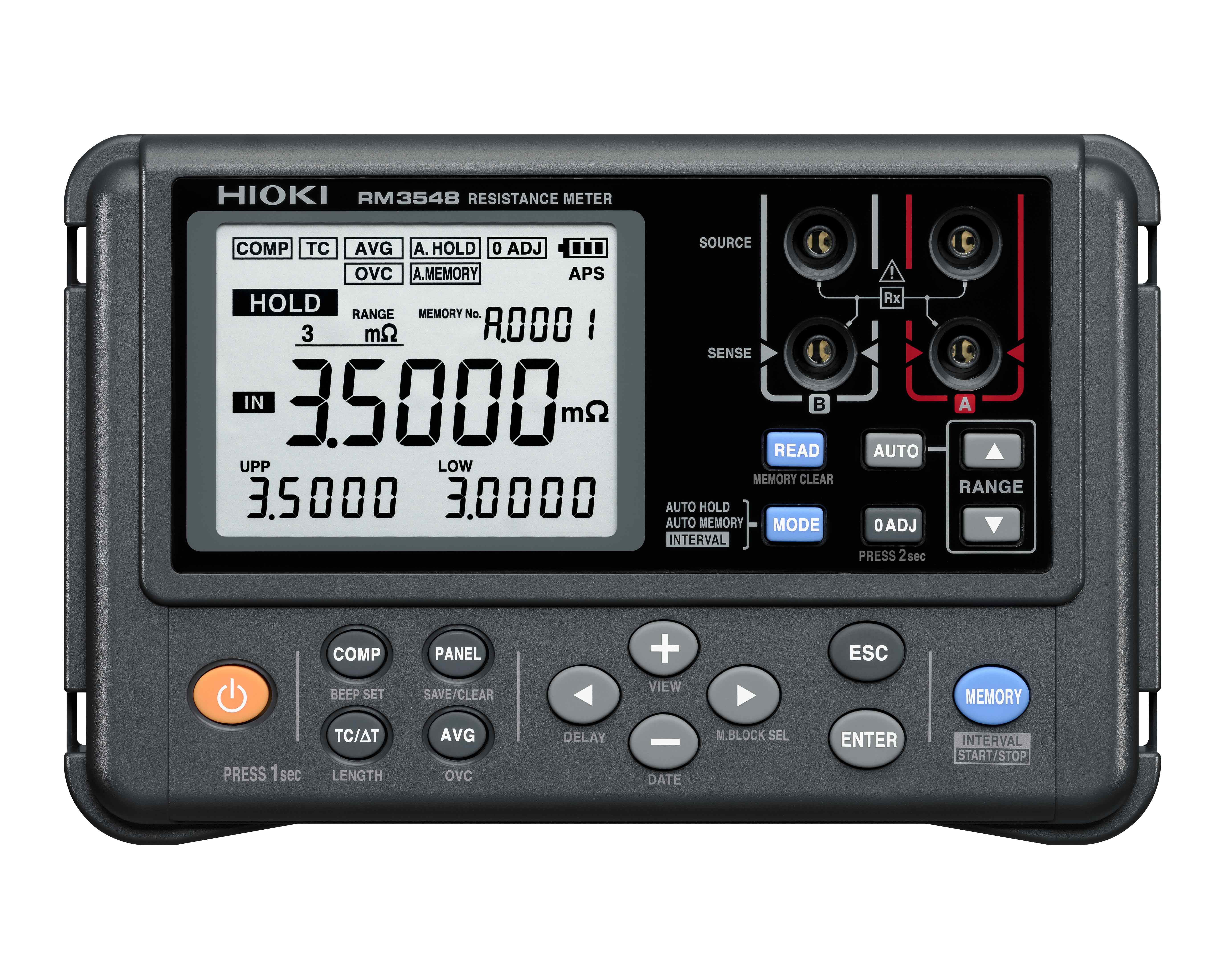 Download Catalog Watch VideoHioki DC resistance meters measure a broad range of resistance values at a high level of precision. The RM3548 is a high-precision, portable resistance meter capable of measuring resistance levels from microohms to megaohms, and is ideal for the testing and maintenance of large equipment, for example, measuring the winding and weld resistances in large motors and stators for hybrid and electric vehicles.