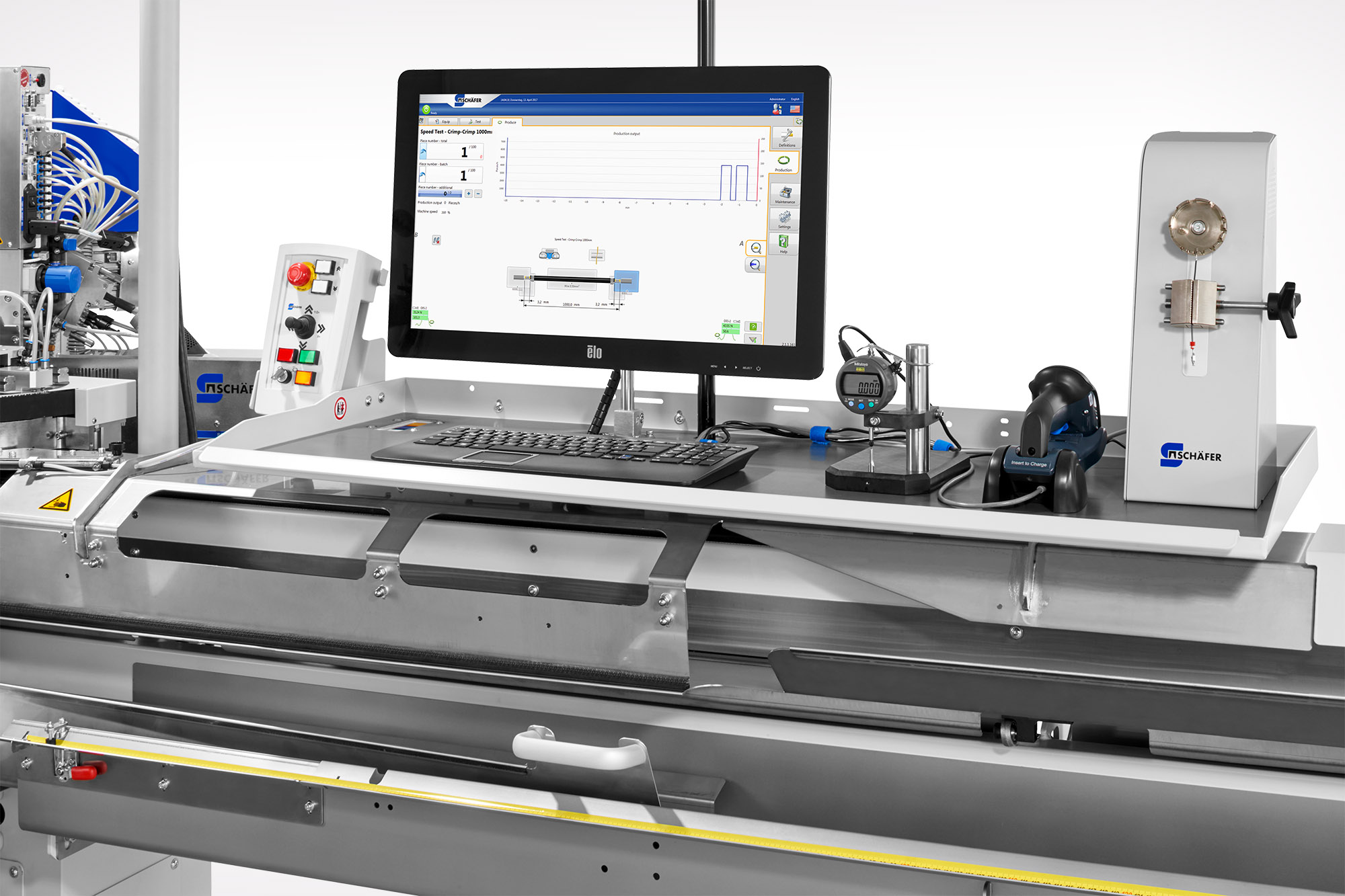 To ensure the product quality, Schäfer offers different optional components. The crimp force monitoring reliably evaluates the quality of crimp connections. The wire quality monitoring system reports bad parts due to faulty stripping. The optical cable quality monitor checks produced cables.