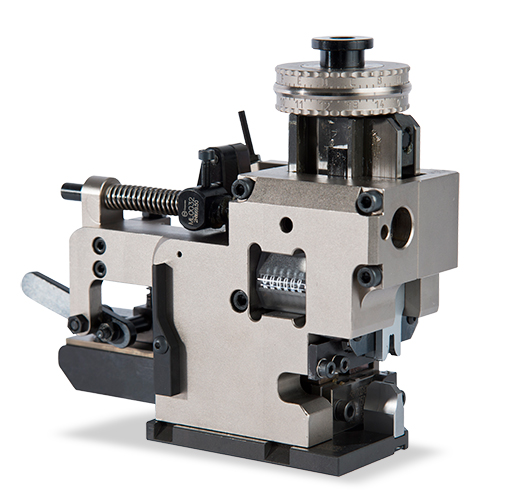 This micrometric device is composed of two overlapped ring nuts and a shared reference index. The upper ring nut, distinguished by a series of letters, allows the adjustment of the pressure on the conductor whilst the second ring nut, distinguished by a series of numbers, allows the adjustment of the pressure on the insulation. At every turn both ring nuts perform the minimum incremental displacement 0.02 mm. The advantage of this system is to offer immediate reading of the indexes and the possibility to discriminate different types of insulation – at equal cross section of the conductor (for ex. Standard, Phase 3 etc.). This applicator allows, additionally, to avoid any intervention on crimping units having different Shut-Height values.