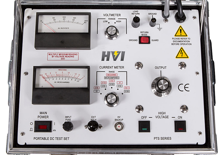 The PTS-200 and PTS-200F are combination high voltage DC proof tester and megohmmeter. Dielectric strength and insulation resistance testing are combined into one instrument saving time, money, size and weight. Equipped with a 5-range current meter scaled 0 – 1 dc microamps for accurate current measurement down to a 10 nanoamp resolution in the x1 range. Using the alternate scale on the current meter allows the PTS Series to double as a Megohmmeter up to 20 teraohms, scaled 100-1 megohms, insulation resistance can be taken at any voltage. An accurate 2 range voltmeter rounds out the standard instrumentation. Additional features include ruggedized anti-static and transit protected meters, rugged two-piece design with foam padded handles, full-wave bridge rectifier, internal shorting solenoid with discharge resistors, and is CE marked. For other voltage options, please see the rest of our PTS Series which range from 15kV to 600kV DC. See our DBT Series for bench-top options. apparatus and cables.