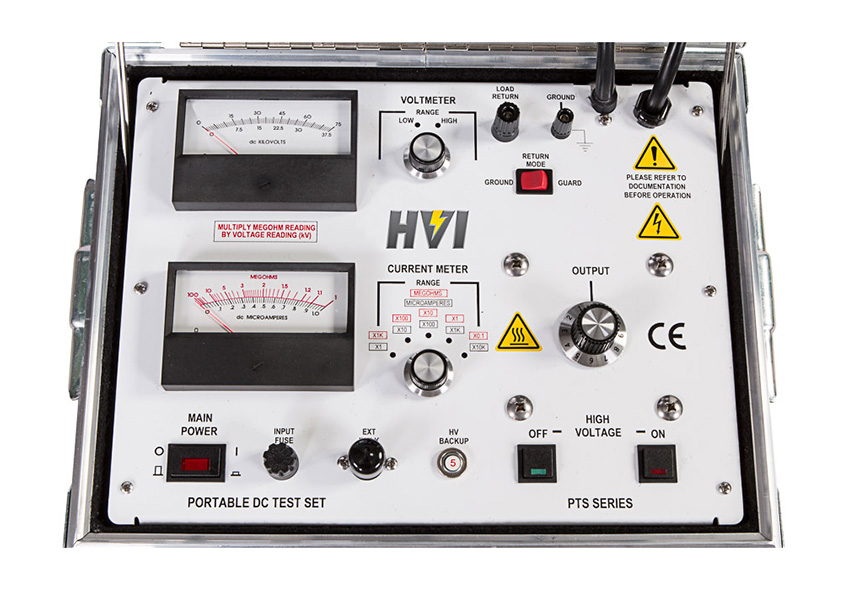 The PTS-75, PTS-75F5 and PTS-75F6 are combination high voltage DC proof tester and megohmmeter. Dielectric strength and insulation resistance testing are combined into one instrument saving time, money, size and weight. Equipped with a 5-range current meter scaled 0 – 1 dc microamps for accurate current measurement down to a 10 nanoamp resolution in the x1 range. Using the alternate scale on the current meter allows the PTS Series to double as a Megohmmeter up to 7.5 teraohms, scaled 100-1 megohms, insulation resistance can be taken at any voltage. An accurate 2 range voltmeter rounds out the standard instrumentation. Additional features include ruggedized anti-static and transit protected meters, rugged single piece design with foam padded handles, full-wave bridge rectifier, internal shorting solenoid with discharge resistors, and is CE marked. For other voltage options, please see the rest of our PTS Series which range from 15kV to 600kV DC. See our DBT Series for bench-top options.us.
