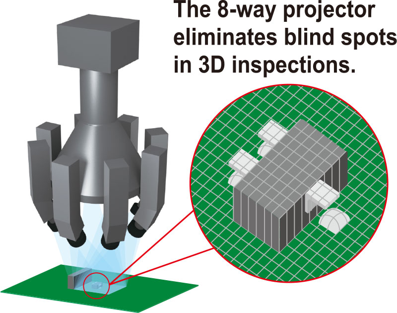 The 8-way projector added to the lineup has enabled inspecting 0201mm components mounted adjacently. The projector reduces the number of blind spots for large components, realizing high-accuracy 3D inspections. The increased 3D measurement range enables 3D inspections of components with heights of up to 25mm.