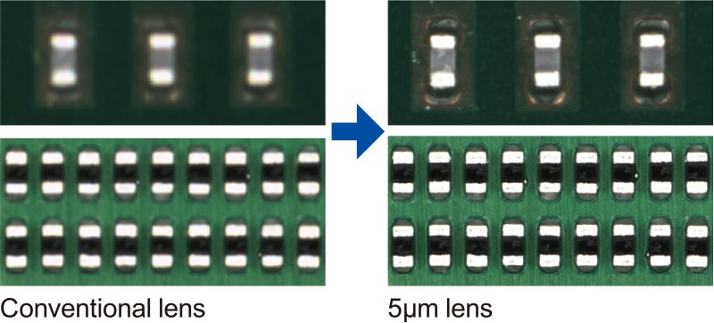 The 5μm lenses added to the lineup are capable of higher definition inspections compared to the conventional 7μm lenses. The lenses improve the performance of high-accuracy inspections of super-tiny components (e.g., 0201mm components) and inspections of minute problems such as cracks and chips on components.