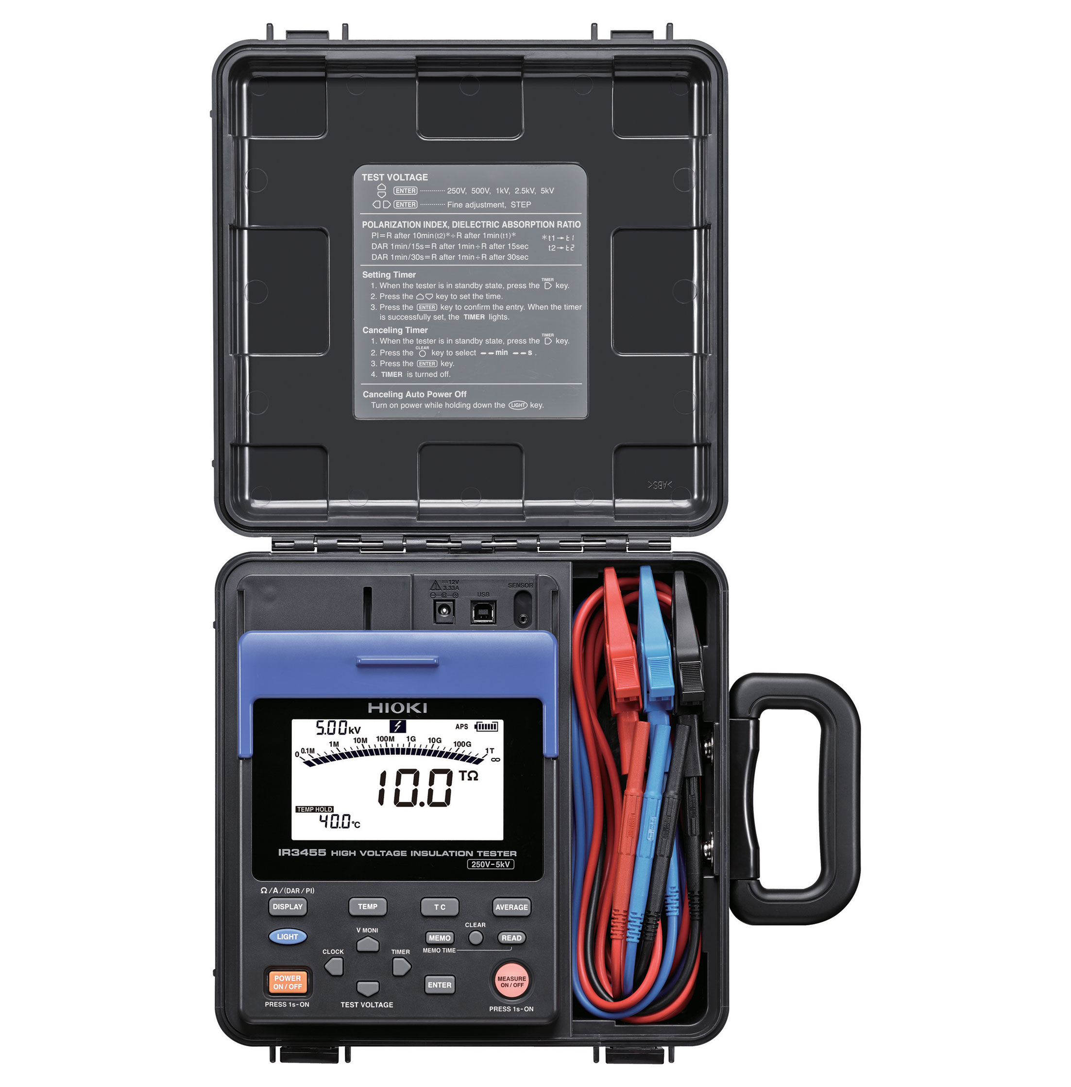 Download CatalogHioki insulation resistance testers or megohmmeters feature all-in-one designs including built-in rugged cases and test lead storage compartments. The IR3455 is a 5-range, 250V to 5000V digital insulation resistance tester offering up to 10TΩ of insulated resistance testing. High performance features include bargraph, built-in memory, leak current and voltage testing, and DAR and PI calculation capabilities to help shorten work time associated with field insulation testing.