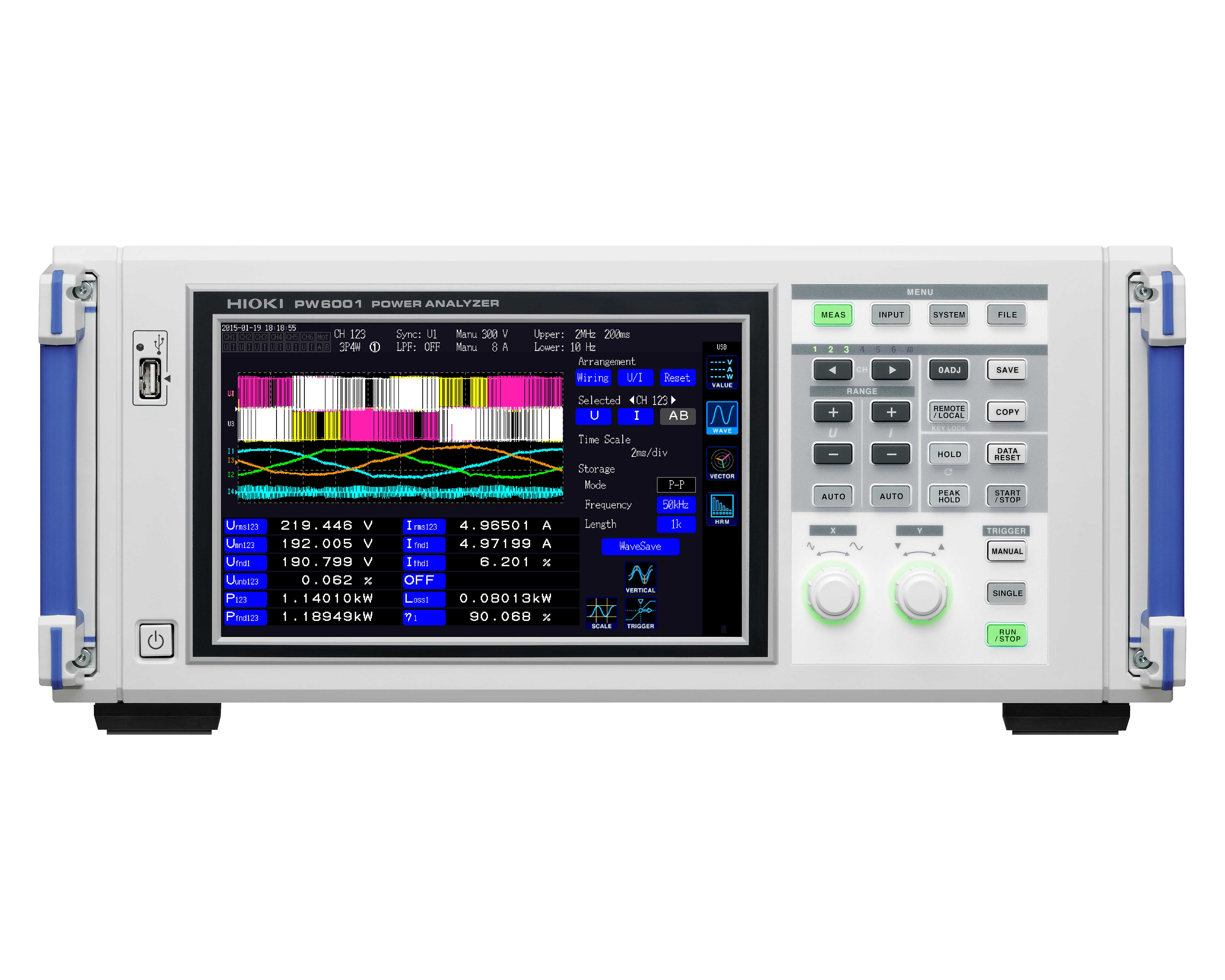 Download Catalog Watch VideoHioki benchtop power meters and power analyzers are best in class power measuring instruments for measuring single to three-phase lines with a high degree of precision and accuracy. The PW6001 is Hioki’s flagship power analyzer, featuring high accuracy, wide band, and high stability for measuring electrical power from DC to inverter frequencies, providing maximum of 12 channels* to support single- and three-phase inverter motor system measurements and next generation devices such as silicon-carbide (SiC) inverters. *When synchronizing two 6-channel models connected via optical link