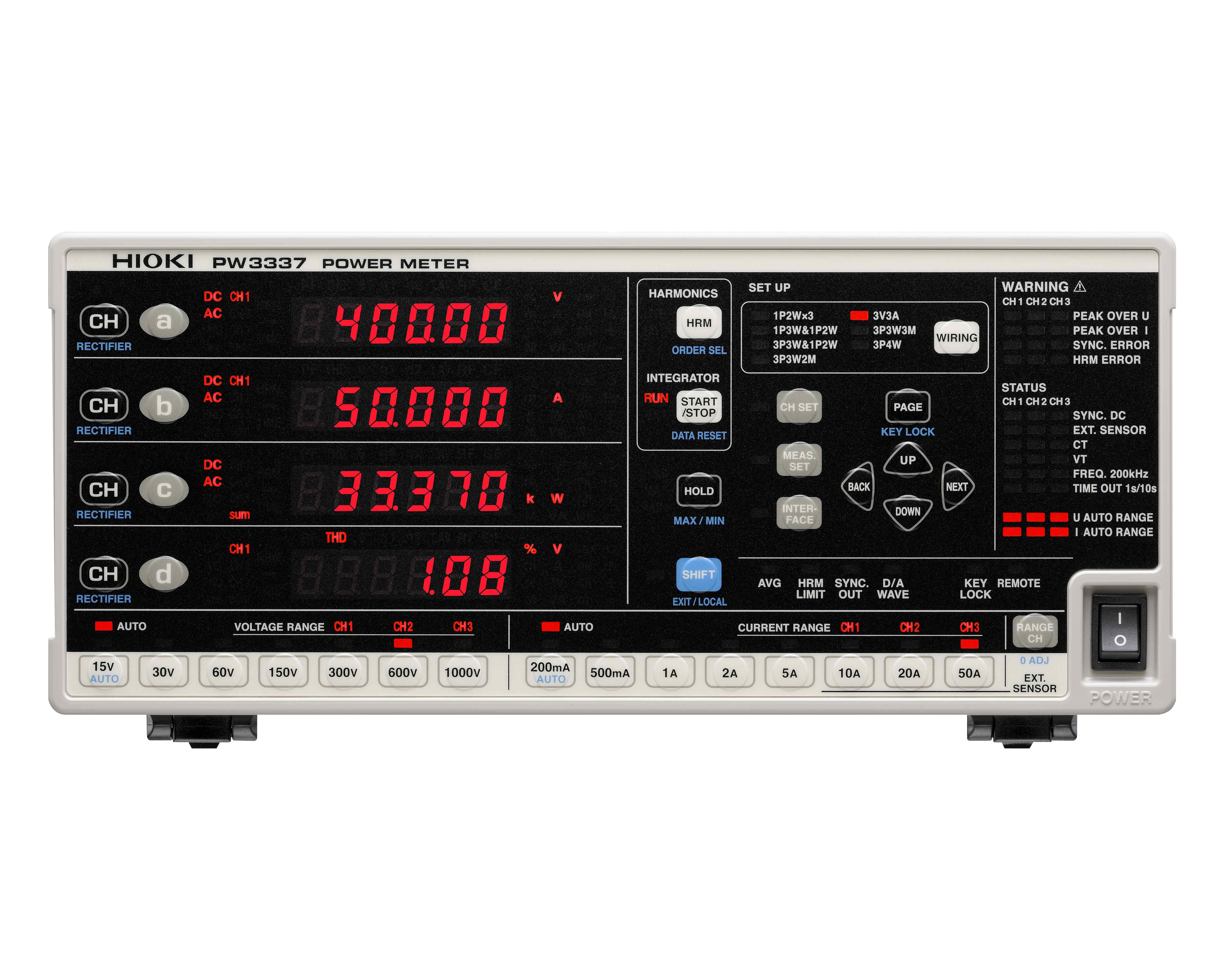 Hioki benchtop power meters and power analyzers are best in class power measuring instruments for measuring single to three-phase lines with a high degree of precision and accuracy. The PW3337 series measure power on the full range of electrical equipment, from single-phase devices such as battery-driven devices and household electronics to industrial use and three-phase electrical equipment over 3 input channels. The power meters provide coverage from DC to inverter frequencies with support for voltages up to 1000 V and direct-input currents of up to 65 A, and can also measure currents of up to 5000 A using an optional current sensor.